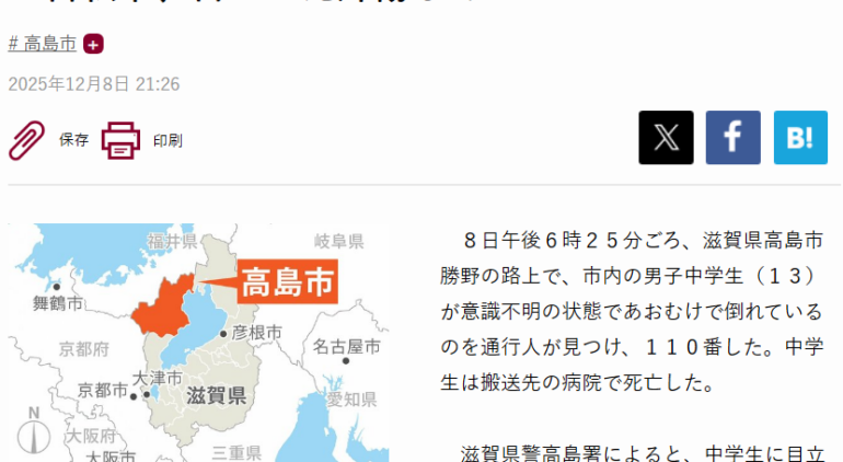 - 事故概要: 2025年12月8日夕刻、高島市勝野の路上で13歳男子中学生が倒れ、死亡。外傷なし、自転車残存。